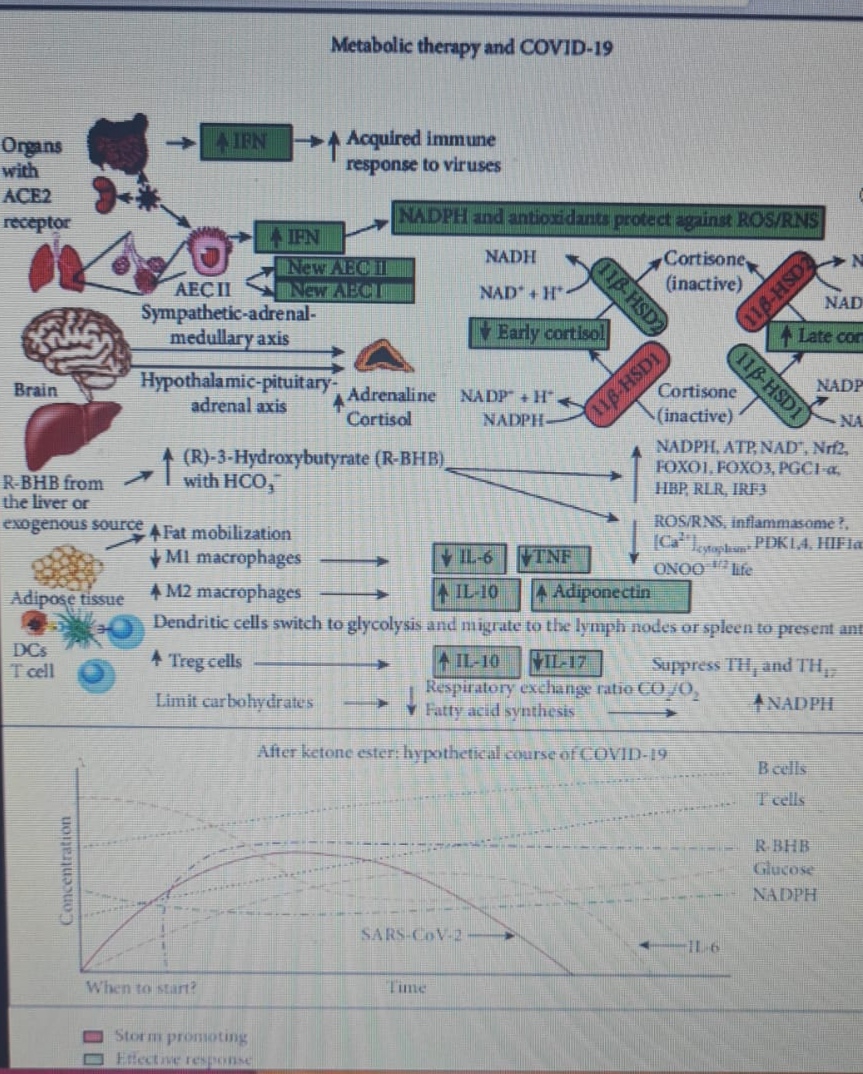 Durante una tormenta de citocinas inducida por virus, la flexibilidad metabólica se ve afectada debido al aumento de los niveles de especies reactivas de oxígeno (ROS) y especies reactivas de nitrógeno (RNS) que dañan los tejidos y regulan a la baja o inactivan muchas enzimas del metabolismo central, incluido el complejo piruvato deshidrogenasa (PDC). Esto conduce a una crisis energética y redox que reduce la proliferación de células B y T y da como resultado una mayor producción de citoquinas y muerte celular. Por lo tanto, las terapias que aumentan los niveles de (R)-beta-hidroxibutirato (R-BHB), como la dieta cetogénica o el consumo de cetonas exógenas, deberían restaurar el metabolismo energético deteriorado y el estado redox (R-BHB activa la señalización antiinflamatoria GPR109A y inhibe el inflamasoma NLRP3 y las histonas desacetilasas).