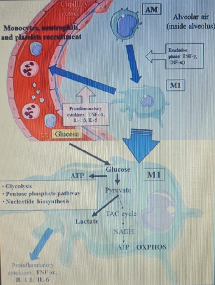 Da un punto di vista metabolico, l’attivazione del fenotipo M1 induce uno spostamento metabolico nella produzione di adenosin trifosfato (ATP) da OXPHOS alla glicolisi aerobica (effetto Warburg). L’attività del ciclo dell’acido tricarbossilico (TCA) è ridotta; mentre la produzione di lattato è aumentata in presenza di ipossia, sovraccarico di glucosio o da entrambe le condizioni.