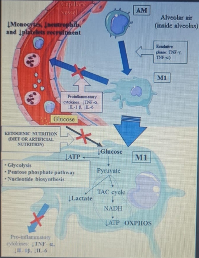 La modulazione della disponibilità di glucosio per i macrofagi M1 attivati ​​mediante una dieta chetogenica eucalorica (EKD) potrebbe rappresentare un possibile strumento metabolico per ridurre la produzione di ATP dalla glicolisi aerobica nel fenotipo del macrofago M1 durante la fase essudativa. Questo approccio potrebbe ridurre la sovrapproduzione di citochine e, di conseguenza, l’accumulo di neutrofili, monociti e piastrine dal sangue. In secondo luogo, una EKD potrebbe essere vantaggiosa per il metabolismo dei macrofagi M2 antinfiammatori perché queste cellule esprimono prevalentemente enzimi di fosforilazione ossidativa e sono meglio alimentate dall’ossidazione degli acidi grassi nei mitocondri. Una EKD potrebbe garantire la disponibilità di acidi grassi liberi, che sono un rifornimento ottimale di “carburante” per queste cellule. In fine, la EKD potrebbe anche ridurre la formazione di lattato da parte dei macrofagi dovuta alla glicolisi, in maniera tale da favorire la produzione di INF-I (poiché questa sarebbe inibita da un’eccessiva produzione di lattato).