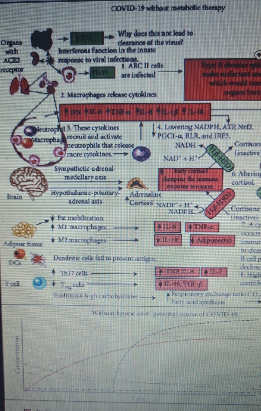 Durante una tempesta di citochine indotta da virus, la flessibilità metabolica è compromessa a causa dell’aumento dei livelli di specie reattive dell’ossigeno (ROS) e delle specie reattive dell’azoto (RNS) che danneggiano i tessuti e sottoregolano o inattivano molti enzimi del metabolismo centrale, compreso il complesso piruvato deidrogenasi (PDC). Ciò porta a una crisi energetica e redox che riduce la proliferazione delle cellule B e T e si traduce in una maggiore produzione di citochine e morte cellulare. Pertanto le terapie che aumentano i livelli di (R)-beta-idrossibutirrato (R-BHB), come la dieta chetogenica o il consumo di chetoni esogeni, dovrebbero ripristinare il metabolismo energetico alterato e lo stato redox (R-BHB attiva la segnalazione antinfiammatoria GPR109A e inibisce l’inflammasoma NLRP3 e le deacetilasi istoniche).