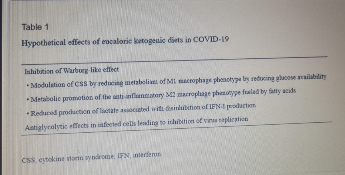 Un’ultima ipotesi metabolica nel trattamento della CoViD-19 emerge da un recente studio in vitro della proteomica delle cellule ospiti infettate da SARS-CoV-2, che mirava a rilevare potenziali bersagli terapeutici. È stato osservato che mirando alla glicolisi con l’inibitore della glicolisi deossi-d-glucosio (un inibitore dell’esochinasi efficace contro altri virus coltivati) la replicazione di SARS-CoV-2 è stata inibita. Poiché gli agenti che riducono l’attività della glicolisi potrebbero essere potenziali agenti terapeutici per il trattamento della CoViD-19, un effetto antiglicolitico simile potrebbe essere ottenuto mediante KD, i cui possibili risvolti sono riassunti nella tabella sottostante.